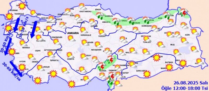 Rüzgar: Kuzey yönlerden hafif ve orta kuvvette, Marmara ve Ege kıyılarında 30-60 km/saat hızla kuvvetli esecek.