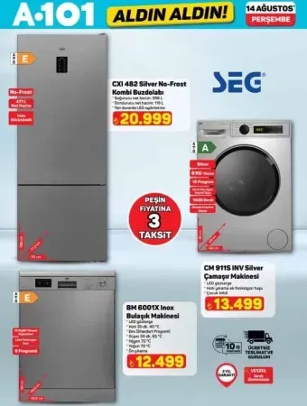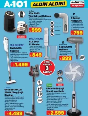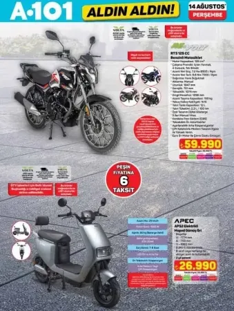 Bu haftanın en dikkat çekenleri arasında elektrikli katlanabilir bisiklet 22.490 TL ve elektrikli moped 26.990 TL bulunuyor. Ayrıca 4 başlıklı masaj aleti 799 TL ile vücudunu rahatlatmak isteyenlere hitap ediyor. 14 Ağustos Perşembe günü başlayacak bu fırsatlar, stoklarla sınırlı olacak. Yani A101 raflarına uğramak için elinizi çabuk tutun, çünkü bu indirimler kısa sürede tükenebilir.