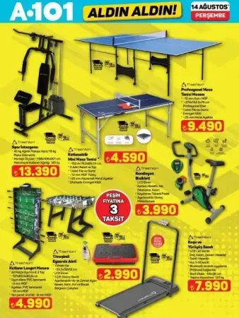 Evde form tutmak isteyenler için A101 bu hafta spor kategorisinde oldukça iddialı. Koşu ve yürüyüş bandı 7.990 TL, spor istasyonu 13.390 TL, kondisyon bisikleti 3.990 TL, titreşimli egzersiz aleti 2.990 TL fiyatıyla dikkat çekiyor. Ayrıca katlanır langırt masası 4.990 TL, masa tenisi seti ise 4.590 TL’den alıcılarını bekliyor.