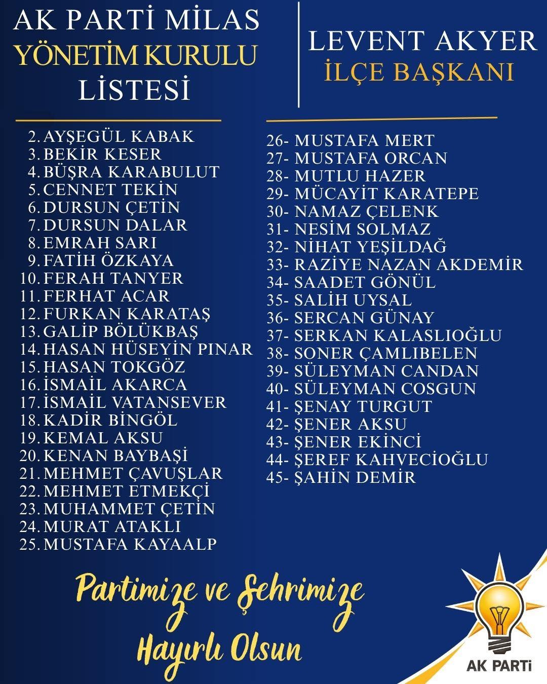 AK Parti Milas İlçe Başkanlığı’nda görev dağılımı sonrası açıklanan asil yönetim kurulu listesi şu isimlerden oluştu: