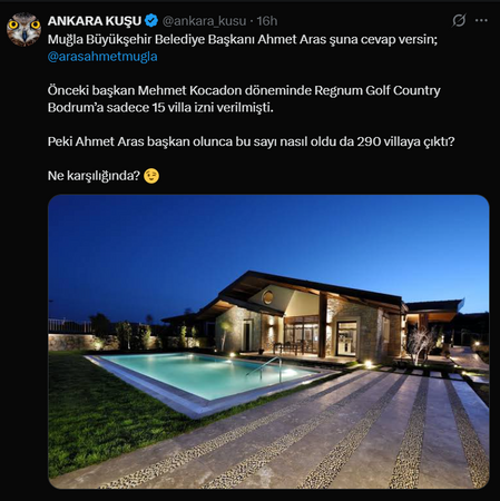 Ankara Kuşu isimli sosyal medya hesabı, geçtiğimiz gece yarısı yaptığı bir paylaşımda, “Saat 00.00’ı bekleyin. Muğla Büyükşehir Belediye Başkanı @arasahmetmugla kaç milyon dolarlık iş yapmış bi bakalım..” diyerek dikkatleri üzerine çekti. Paylaşımlarda, Ahmet Aras’ın belediye başkanı olduktan sonra Regnum Golf Country Bodrum adlı tesiste villa sayısını 15’ten 290’a çıkardığı, bunun karşılığında ne alındığının sorgulanması gerektiği ifade edildi.