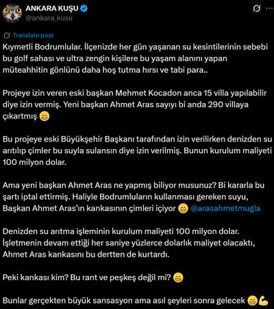 Aynı hesap, “Kıymetli Bodrumlular. İlçenizde her gün yaşanan su kesintilerinin sebebi bu golf sahası ve ultra zengin kişilere bu yaşam alanını yapan müteahhitin gönlünü hoş tutma hırsı ve para…” ifadeleriyle su krizinin projeyle bağlantılı olduğunu ileri sürdü. Ankara Kuşu, söz konusu projeye eski başkan Mehmet Kocadon döneminde yalnızca 15 villa izni verildiğini, Ahmet Aras’ın ise bu sayıyı 290’a çıkardığını öne sürdü.