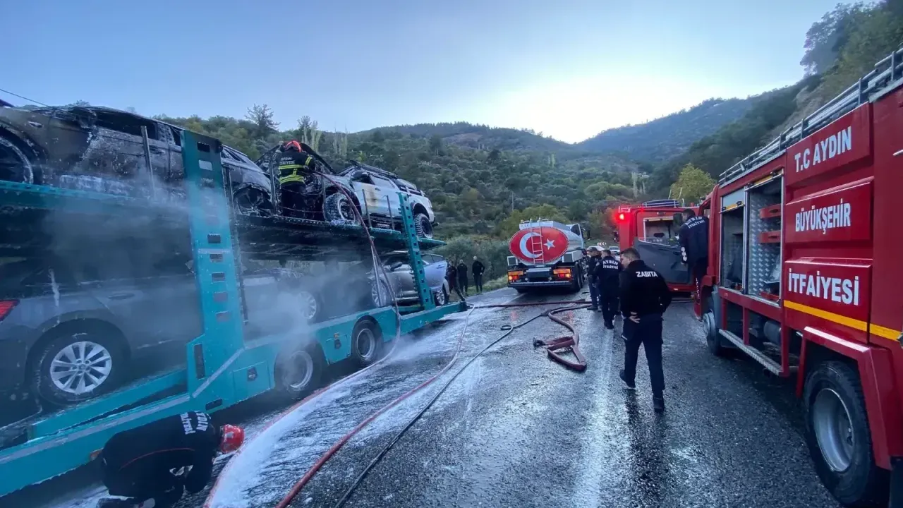 Aydın'ın Bozdoğan ilçesinde üzerinde araç yüklü tırda çıkan yangın ekiplerin müdahalesiyle söndürülürken, tırdaki araçlar kullanılamaz hale geldi.