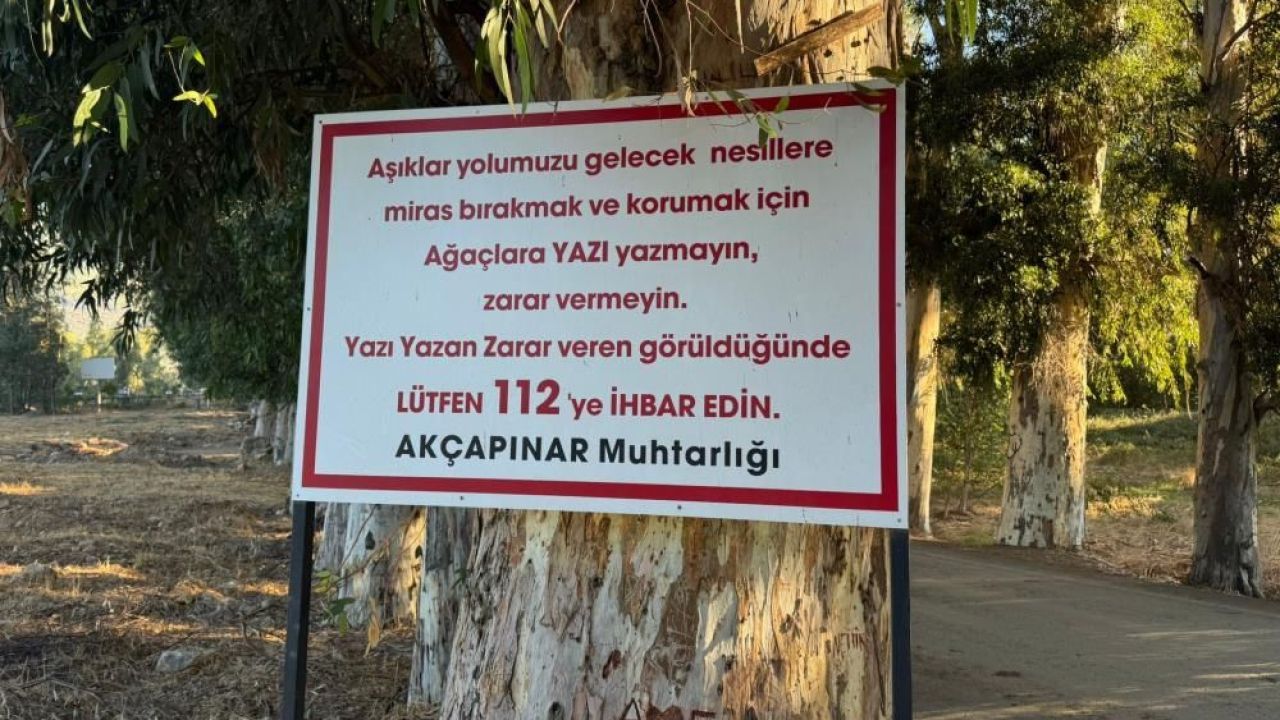 Tabelada, "Aşıklar yolumuzu gelecek nesillere miras bırakmak ve korumak için ağaçlara yazı yazmayın, zarar vermeyin. Yazı yazan veya zarar veren görüldüğünde lütfen 112’ye ihbar edin" ifadeleri yer aldı