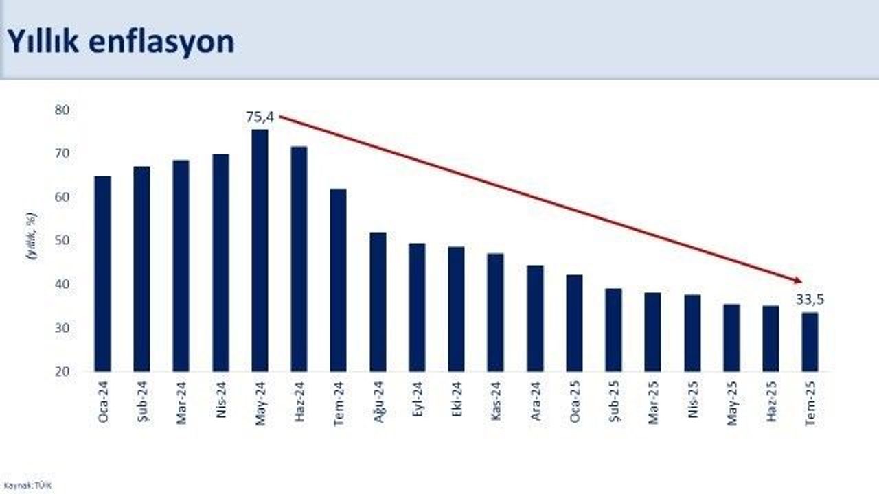 "Enflasyon 44 ayın en düşük seviyesinde. Aylık enflasyon temmuzda geçici ve dönemsel etkilerle yüzde 2,06 gerçekleşirken yıllık enflasyon son 12 ayda 28,3 puan düşüşle yüzde 33,5’e geriledi. Yıllık gıda enflasyonu yüzde 28, temel mal enflasyonu yüzde 20,7 oldu. Hizmet enflasyonu üç yılı aşkın sürenin ardından ilk kez yüzde 50’nin altına indi. Dezenflasyon süreci hedeflerimiz doğrultusunda ilerlemektedir. Yıl sonunda enflasyonun TCMB’nin tahmin aralığında gerçekleşeceğini öngörüyoruz. Enflasyondaki düşüş, öngörülebilirliği artırarak yurtiçi finansal şartların ve yatırım ortamının daha da iyileşmesine katkı sağlayacaktır. Temel önceliğimiz olan kalıcı fiyat istikrarını sağlamak için programımızı kararlılıkla uygulamaya devam edeceğiz."