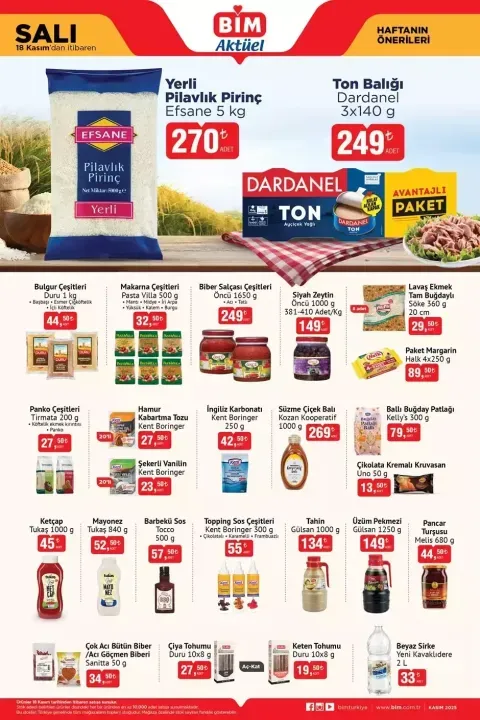 BİM 18 Kasım 2025 aktüel ürünler kataloğu yayınlandı. Gıda, donmuş ürünler, abur cubur ve temel ihtiyaçlarda indirim fırsatları raflara geliyor. 500 gr dana kangal sucuk 229 TL, 1500 gr yarım yağlı tost peyniri 289 TL’den satışa çıkacak. İşte 18 Kasım BİM indirim listesi!