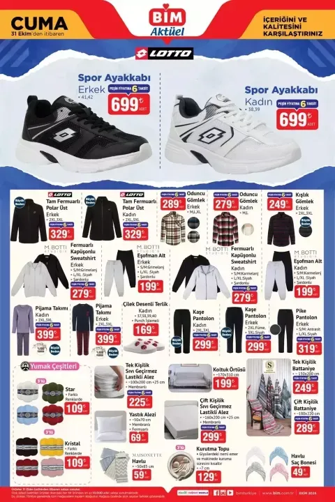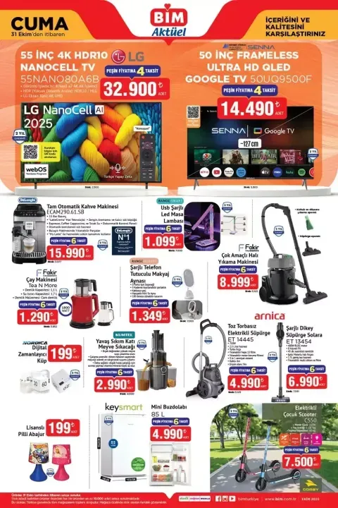 BİM’in 31 Ekim – 5 Kasım tarihleri arasında geçerli olan yeni aktüel kataloğu satışa çıktı. Ekim ayının son fırsatlarıyla dolu katalogda LG 4K NanoCell TV, Tam Otomatik Kahve Makinesi, Fakir Çay Makinesi, Katı Meyve Sıkacağı, Elektrikli Çocuk Scooter, spor ayakkabılar, mutfak ve cam ürünleri yer alıyor. İşte 31 Ekim Cuma’dan 5 Kasım Salı’ya kadar geçerli BİM aktüel ürünler kataloğunun tam listesi ve fiyatları...