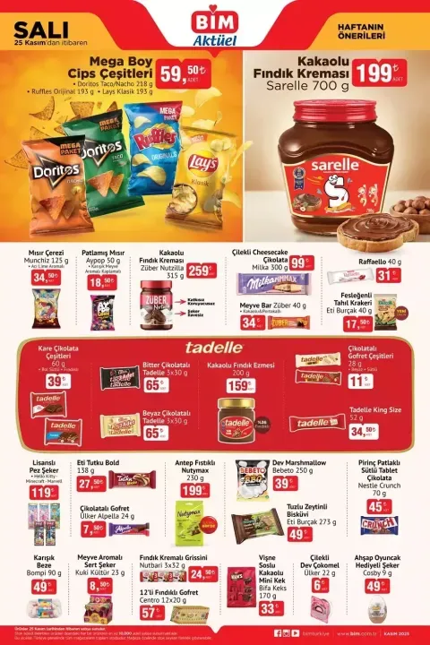 BİM, 25–28 Kasım aktüel kataloğunu yayımladı. Televizyon, cep telefonu, tıraş makinesi, çocuk oyuncakları, mutfak setleri, ev tekstili, kişisel bakım cihazları, çikolata ve atıştırmalık ürünlerde dikkat çeken fırsatlar raflara geliyor. Elektronikten oyuncaklara, mutfak ürünlerinden giyime kadar yüzlerce farklı üründe avantajlı fiyatlar sunuluyor. İşte katalogda öne çıkan tüm ürünler ve detaylı fiyat listesi…