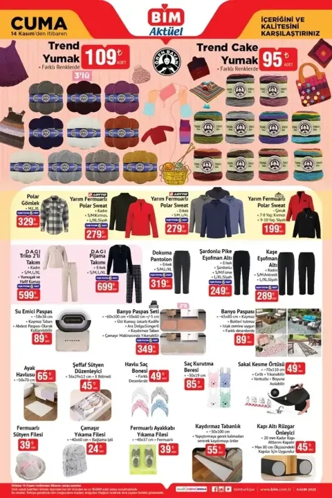 BİM 14 Kasım 2025 aktüel ürünler kataloğu yayımlandı. Bu hafta BİM raflarında Dijitsu 58” QLED TV, Keysmart mini buzdolabı, Fakir süpürge, Homend kahve makinesi, örgü ipleri, polar kıyafetler ve Barbie-Minecraft oyuncakları yer alıyor. İşte BİM 14 Kasım indirimli ürün listesi!