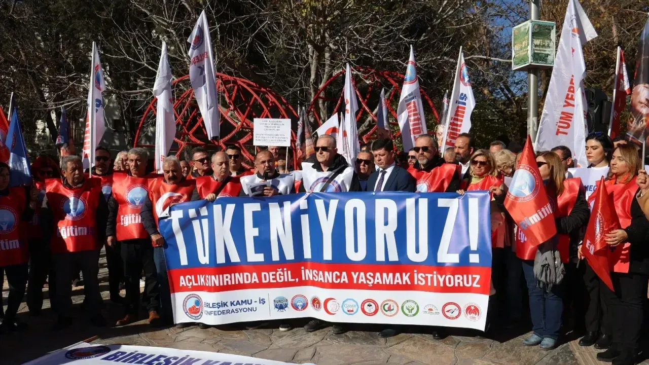“Birleşik Kamu-İş Konfederasyonu’na bağlı sendikalar olarak; AKP iktidarının emekçiyi yoksullaştıran, sermayeyi koruyan ekonomi politikalarına karşı insanca yaşam, adil ücret ve hakça paylaşım talebiyle 19 Aralık’ta üretimden gelen gücümüzü kullanıyor, iş bırakıyoruz. Bugün Türkiye’nin en büyük üçüncü kamu emekçileri konfederasyonu Birleşik Kamu-İş olarak işyerlerimizde değil meydanlardayız. Neden işyerlerimizde değil meydanlardayız? Adına Toplu Sözleşme dedikleri rezil tiyatroda emeğimizin hakkını gasp edenler, şimdi biz emekçilerin durumunu gözetmeden bütçe yaptıkları için tükeniyoruz. Nasıl bir yoksulluk sarmalına atıldığımızı, göz göre göre nasıl nefes alamaz hale getirildiğimizi doğruca anlatabilmek için yakın geçmişe bir bakalım: Halk olarak içine düştüğümüz ağır ekonomik krizin temelleri mevcut iktidar tarafından atıldı. Özelleştirme eliyle Cumhuriyet yadigarı olan fabrikalar, sadece arsalarının bedeli kadar düşük fiyatlara yandaşlara peşkeş çekildi. Ülkemiz üretmeden tüketen bir ülke haline getirildi. “Dolarla mı maaş alıyorsunuz, size ne dolardan” denirken ülkede toplu iğne almak için bile dolar kuru takip edilir hale geldi. Üstüne bir de “faiz sebep, enflasyon sonuç” gibi, kabul gören tüm ekonomi doktrinleriyle çelişen bir zihniyette yıllardır sürdürülen ısrar, ülkede yoksulun daha yoksul zenginin daha zengin olduğu, ekonominin orta direği denen orta sınıfın yok olduğu bu karanlık ekonomik iklimi getirdi.”