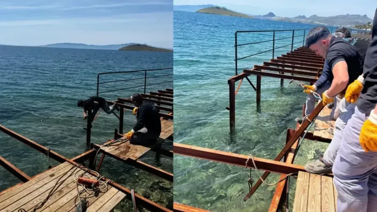 Muğla'nın Bodrum ilçesinde kaçak yapılarla mücadele sürerken, bir siteye ait kaçak iskele de belediye ekipleri tarafından söküldü.