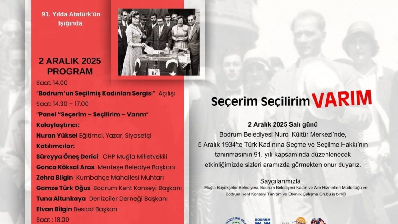 Muğla Büyükşehir Belediyesi, Bodrum Belediyesi Kadın ve Aile Hizmetleri Müdürlüğü ve Bodrum Kent Konseyi Tanıtım ve Etkinlik Çalışma Grubu iş birliğiyle hazırlanan "Seçerim Seçilirim Varım" başlıklı program, 2 Aralık 2025 Salı günü saat 14.00 itibarıyla Nurol Kültür Merkezi'nde halka açık ve ücretsiz olarak gerçekleştirilecek.