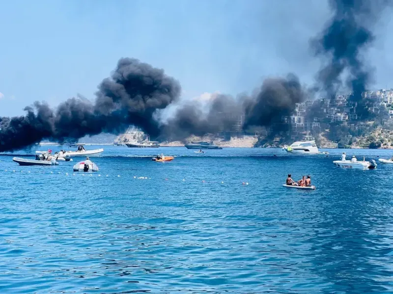 Muğla'nın Bodrum ilçesi Gündoğan Koyu'nda, demirli bir teknede henüz belirlenemeyen nedenle yangın çıktı.
