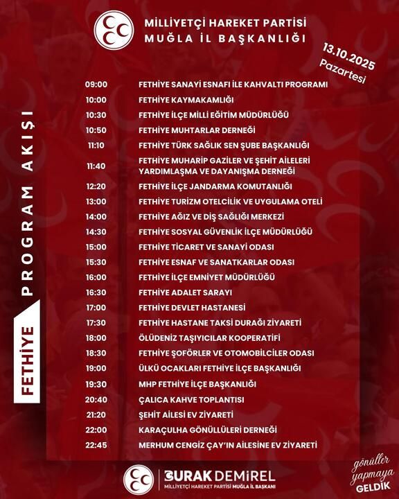 Milliyetçi Hareket Partisi (MHP) Muğla İl Başkanı Burak Demirel, 13 Ekim Pazartesi günü Fethiye’de sabah erken saatlerden geceye kadar sürecek yoğun bir ziyaret programı gerçekleştirecek. Demirel’in programı, kamu kurumları, sivil toplum kuruluşları, esnaf temsilcileri ve vatandaşlarla birebir görüşmeleri kapsıyor.