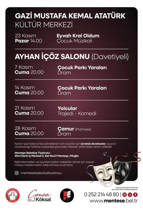 Ayhan İçöz Salonu'nda sahnelenecek ücretsiz oyunlar için davetiyeler, oyunun oynanacağı haftanın Pazartesi gününden itibaren Zihni Derin İş Merkezindeki Menteşe Belediye Tiyatrosu ofisinden alınabilecek.