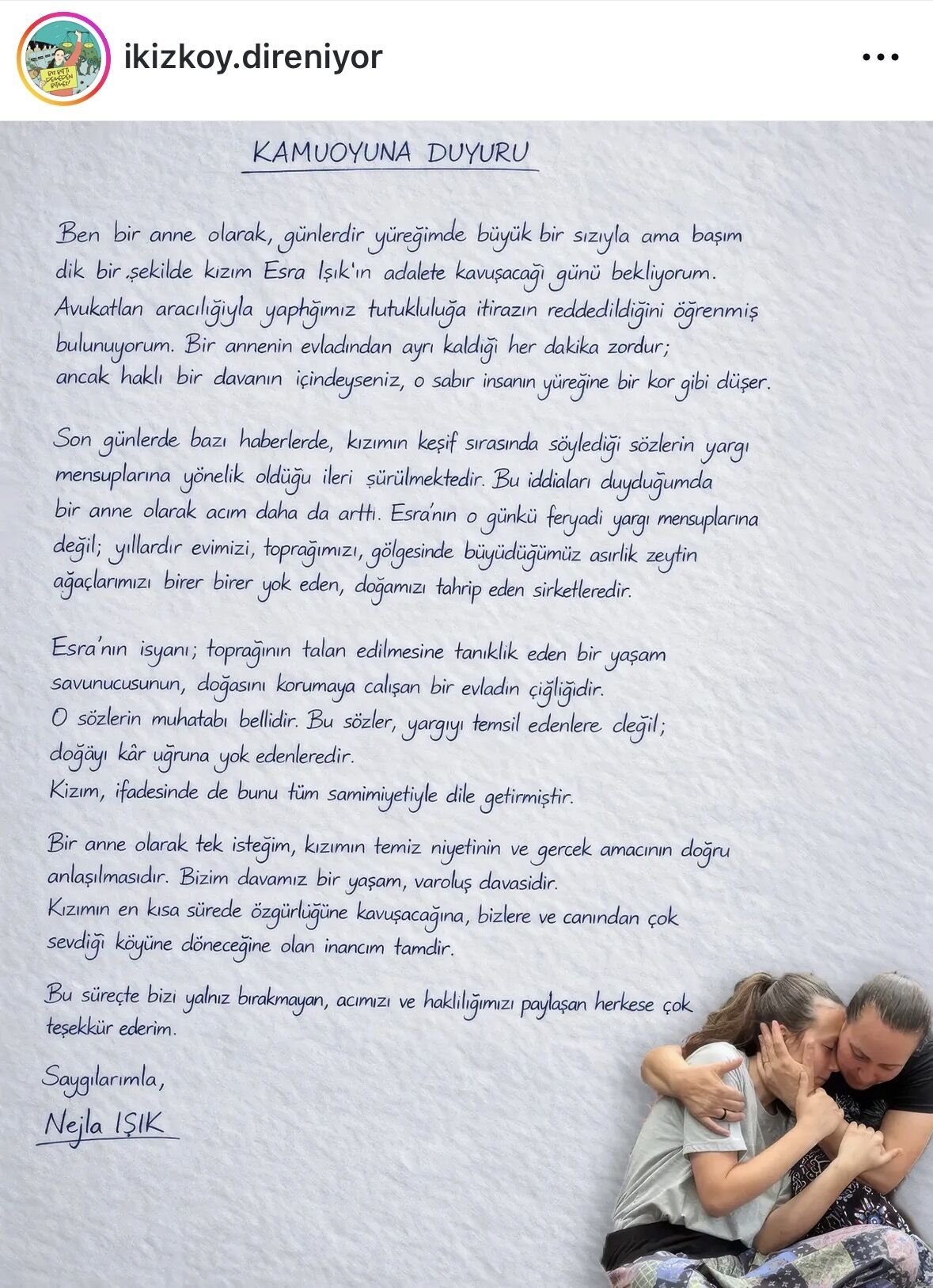 Muğla’nın Milas ilçesinde Akbelen Ormanı süreci kapsamında tutuklanan Esra Işık’ın annesi Nejla Işık, sosyal medya üzerinden yaptığı açıklamayla kamuoyuna seslendi. İkizköy Mahalle Muhtarı olan Işık, açıklamasında bir anne olarak yaşadığı süreci ve kızının durumuna ilişkin düşüncelerini paylaştı.