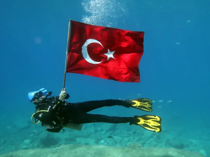 30 Ağustos Zafer Bayramı’nın 103. yılı kapsamında Fethiye’de farklı ve anlamlı bir etkinlik düzenlendi. Fethiyeli dalgıçlar, Dalyan Koyu’nda 8 metre derinlikte Türk bayrağı açarak bayram coşkusunu deniz altına taşıdı.