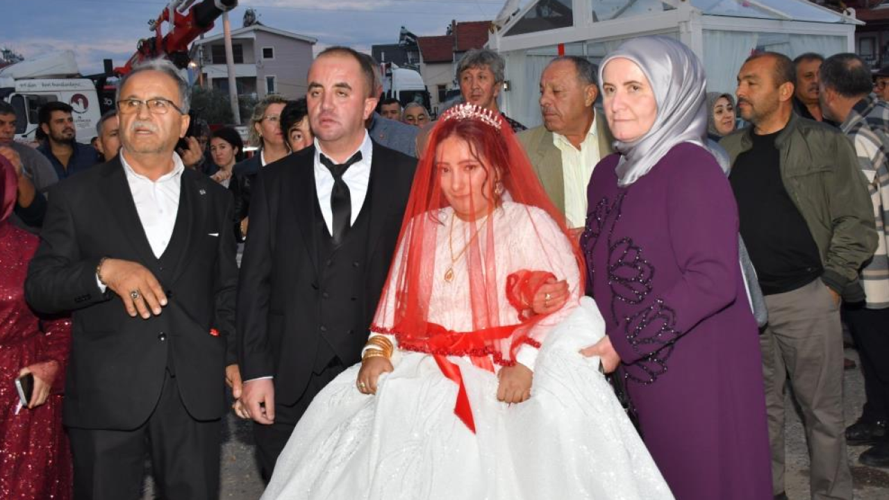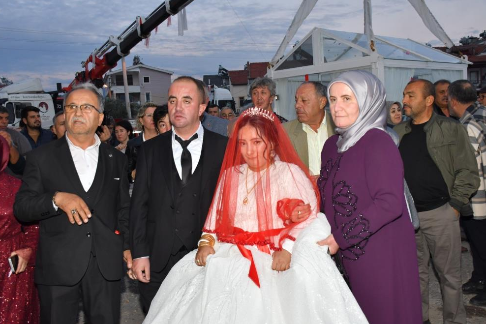 Fethiye ve Seydikemer ilçelerinin siyaset esnaf ve ticaret dünyasından yoğun katılımın olduğu düğün töreninde gelin almaya özel yaptırılıp tıra yüklenen cam vitrin ile gidildi. Cam vitrin kız evinde vinçle tırdan indirilirken, gelin Merve Sarıman ve damat Berat Çetinkaya dualarla cam vitrine girdi. Cam vitrin vinçle tekrar tıra alkışlar arasında yüklendi. Gelini alan damat tarafları konvoy eşliğinde Seydikemer ilçesinden Fethiye'ye hareket etti. Tırda gelin ve damadı cam vitrinde görenler bu anı cep telefonlarıyla görüntülemeye çalıştı. Tır üzerinde cam vitrin içinde Çatalarık Mahallesi sosyal tesislerine çift geldiğinde çok sayıda davetli alkış tuttu. Cam vitrin içindeki çift burada da vinç yardımıyla tırdan yine alkışlar arasında indirildi.