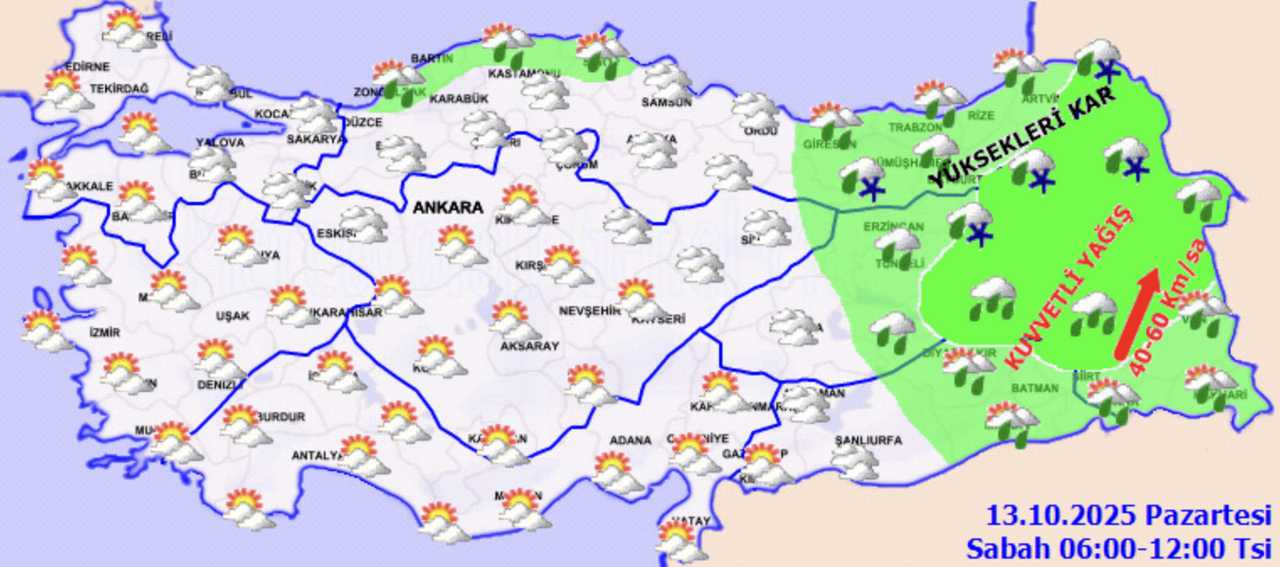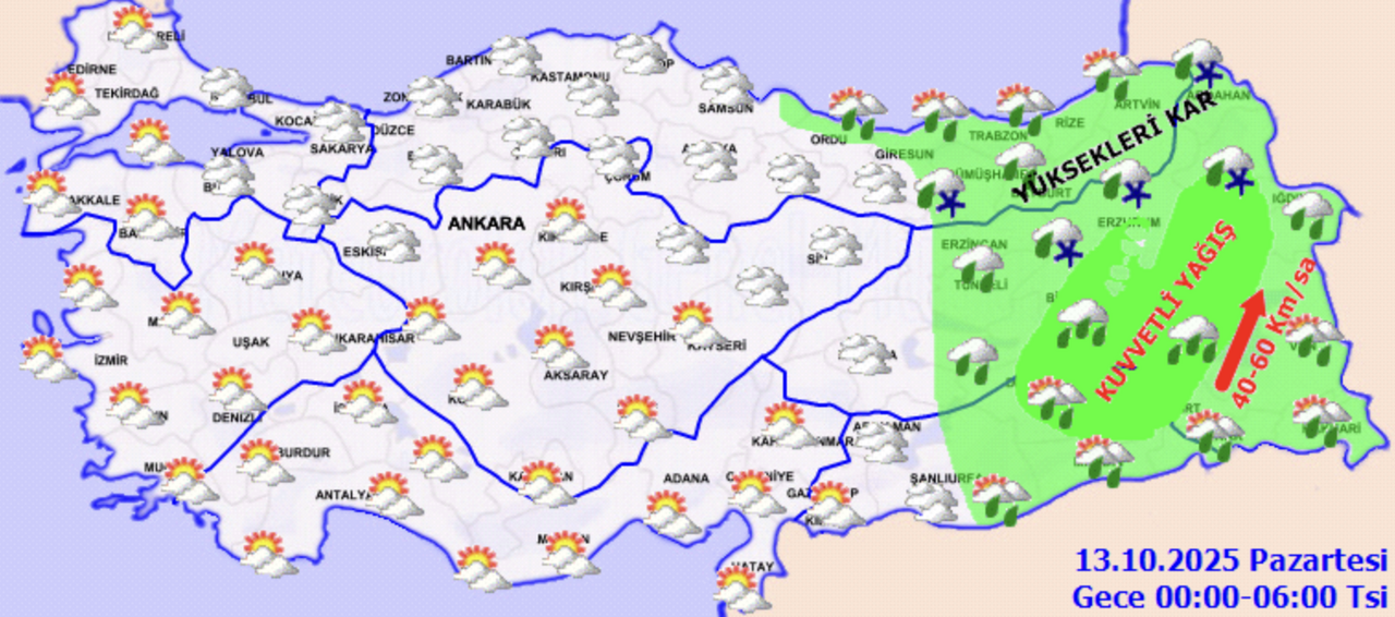 Rüzgâr: Genellikle kuzey ve kuzeybatı, ülkenin doğu kesimlerinde güney ve güneybatı yönlerinden hafif ara sıra orta kuvvette esecek. Güney Ege, Akdeniz’in iç kesimleri, İç Anadolu’nun güneyi ve Orta Karadeniz kıyılarında kuzeyli yönlerden; Doğu Anadolu’da güneyli yönlerden 40–60 km/saat hızla kuvvetli rüzgâr bekleniyor.