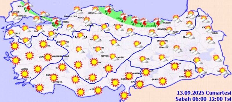 Ülkenin kuzey ve batı kesimleri parçalı yer yer çok bulutlu olacak. Orta ve Doğu Karadeniz kıyıları, Sinop, Sakarya, Çankırı, Ankara çevreleri ile Kocaeli, İstanbul’un kuzeyi, Eskişehir’in güney ve doğusu, Afyonkarahisar’ın doğusu, Konya’nın kuzey ve batısı ile Kastamonu ve Kırklareli kıyılarında yerel sağanak ve gök gürültülü sağanak yağış bekleniyor. Diğer bölgelerde hava az bulutlu ve açık geçecek.
