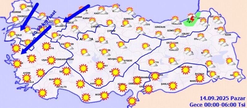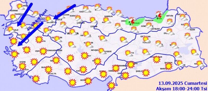Marmara, Kuzey Ege kıyıları ve Batı Karadeniz kıyılarında rüzgarın kuzey ve kuzeydoğu yönlerden saatte 40-60 kilometre hızla eseceği tahmin ediliyor. Yetkililer, yaşanabilecek olumsuzluklara karşı vatandaşların dikkatli ve tedbirli olmalarını istedi.