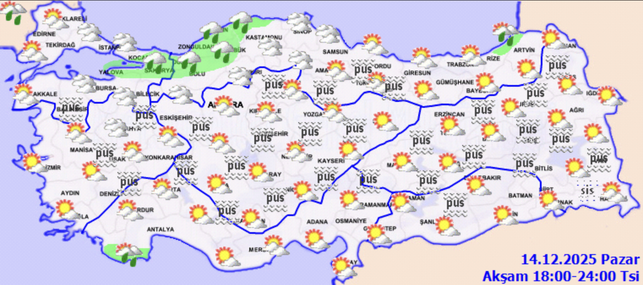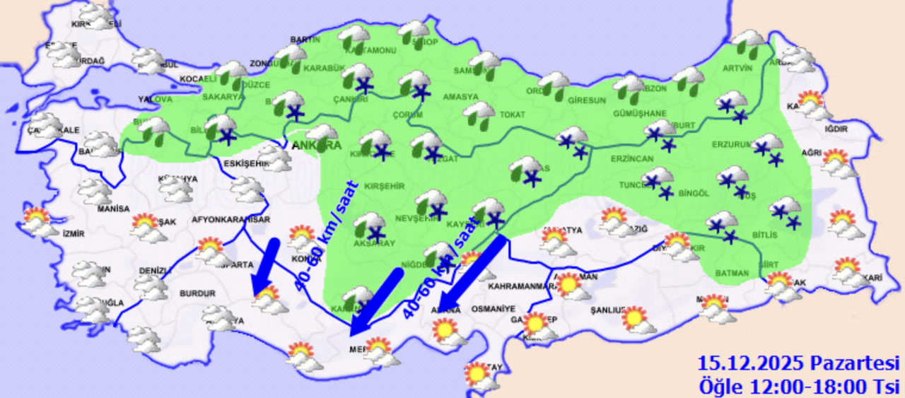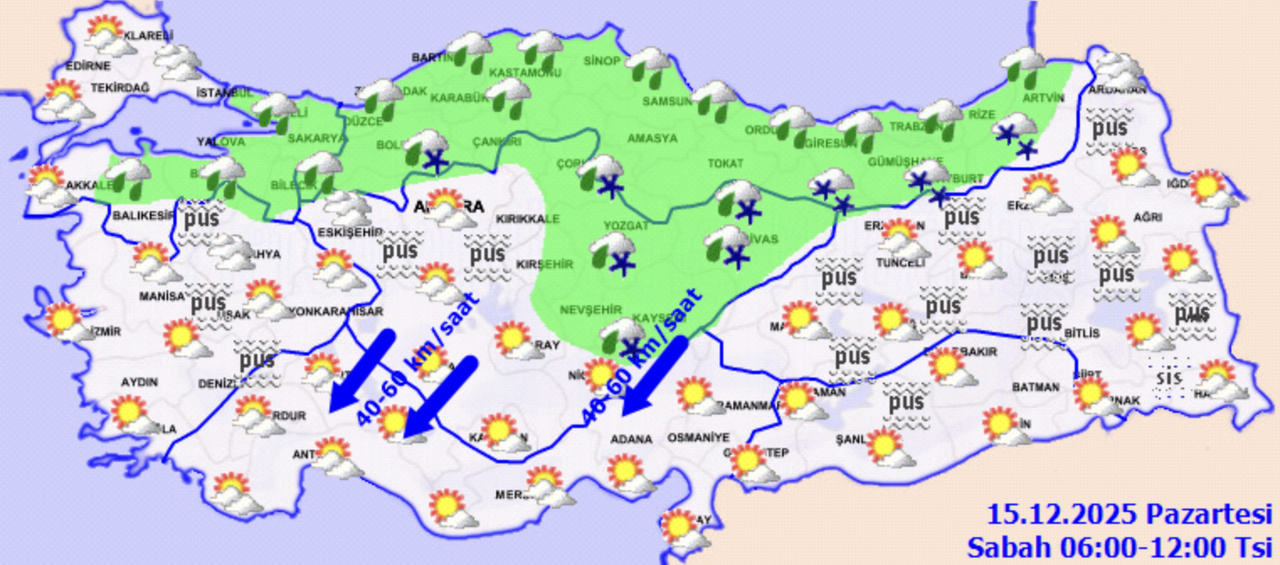 Meteoroloji Genel Müdürlüğü tahminlerine göre ülke genelinde hava parçalı ve çok bulutlu olacak. Marmara ve İç Anadolu’nun doğusu, Karadeniz genelinde; ayrıca Ankara, Çankırı, Batman, Siirt, Erzincan, Erzurum, Tunceli, Bingöl, Muş ve Bitlis çevreleri ile akşam saatlerinde Antalya’nın batı kıyı ilçelerinde yağış bekleniyor. Yağışların kıyı kesimlerde yağmur ve sağanak, iç kesimlerde ise karla karışık yağmur ve yer yer kar şeklinde görüleceği tahmin ediliyor. Gece ve sabah saatlerinde iç ve doğu bölgelerde pus ve yer yer sis etkili olacak. Öte yandan Akdeniz’in iç kesimlerinde rüzgârın kuzey ve kuzeydoğu yönlerden kuvvetli (40–60 km/sa) eseceği bildirildi.