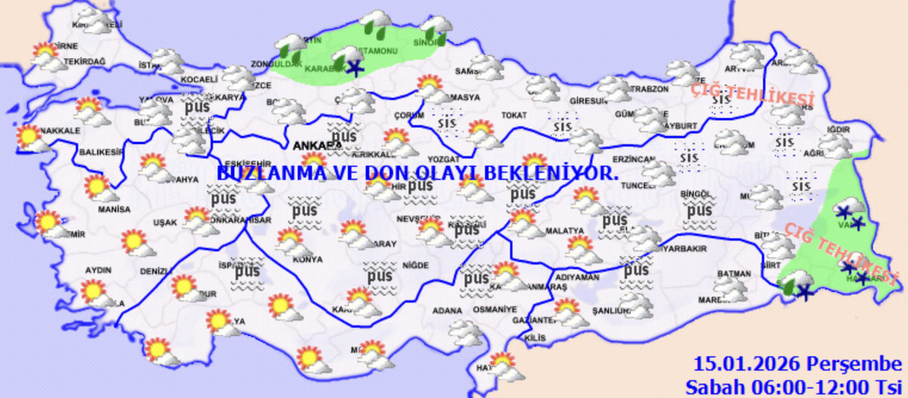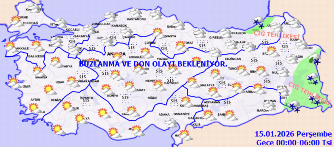 Parçalı ve çok bulutlu, Şırnak, Hakkari, Muş ve Van çevrelerinin aralıklı karla karışık yağmur ve kar yağışlı geçeceği tahmin ediliyor. Bölge genelinde buzlanma ve don ile birlikte pus ve yer yer sis bekleniyor. Bölgenin doğusunun yüksek kar örtüsüne sahip eğimli kesimlerinde çığ tehlikesi bulunmaktadır.