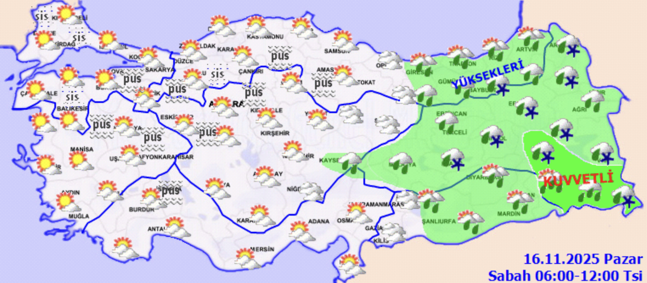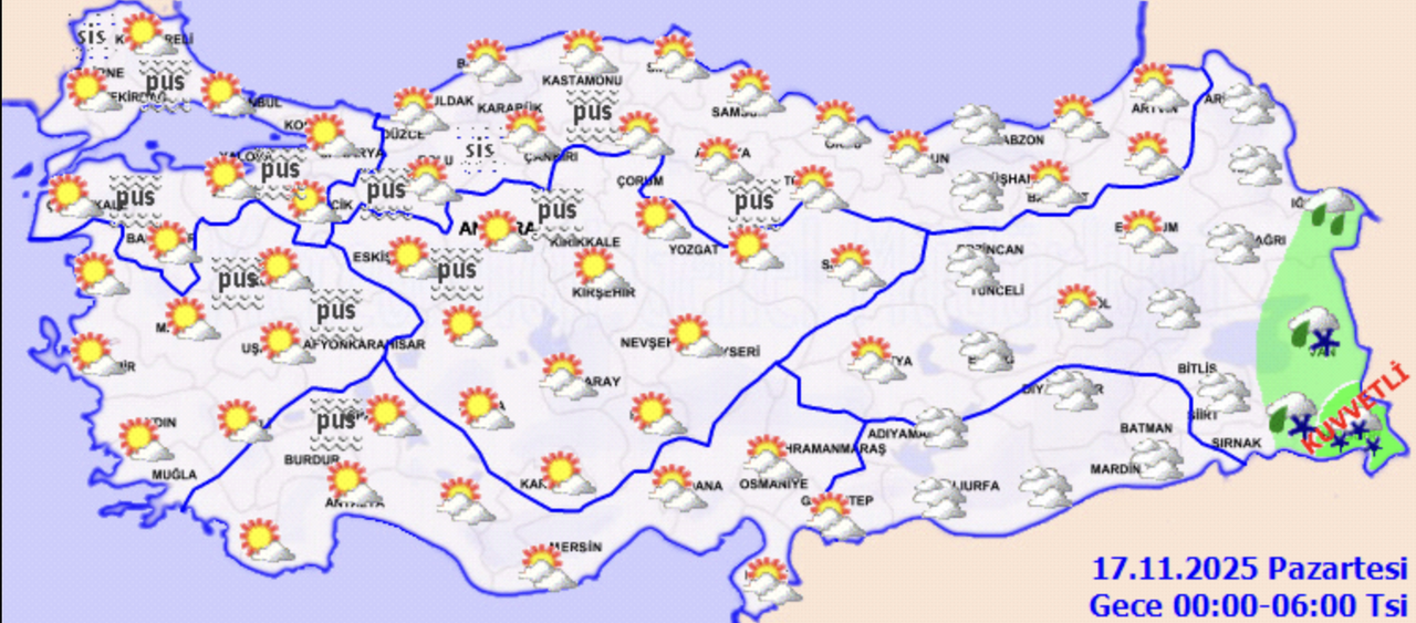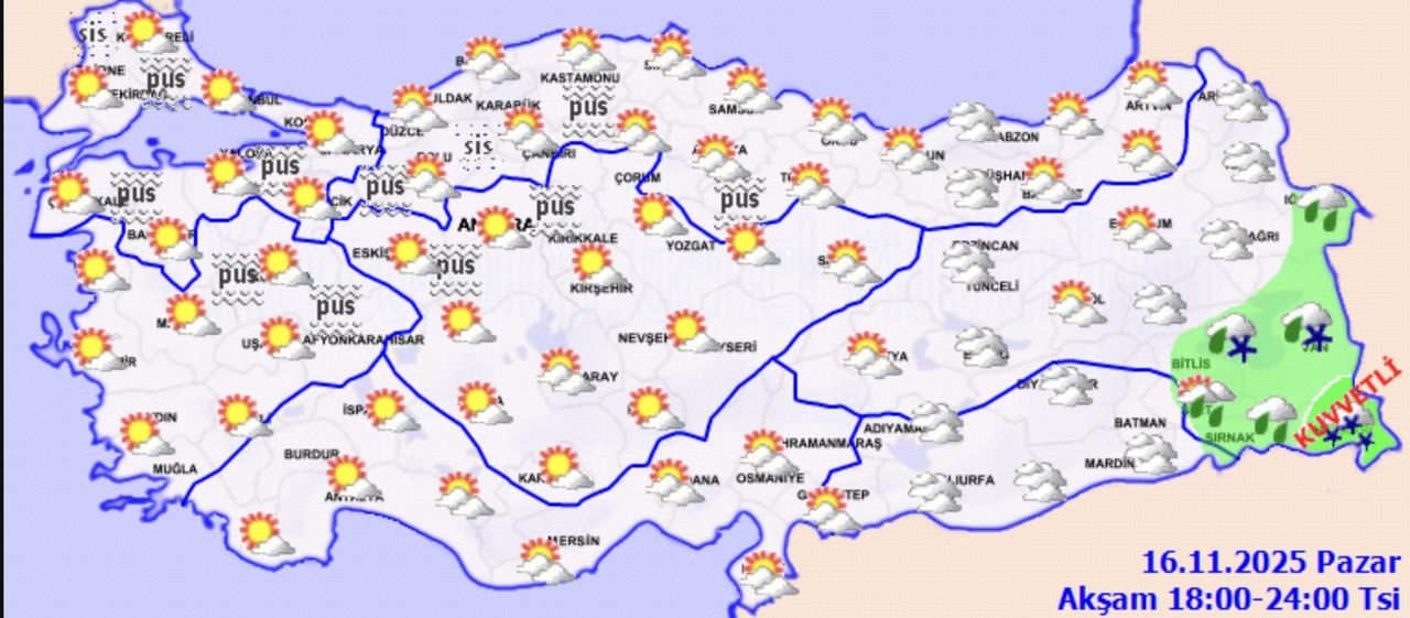 Gece ve sabah saatlerinde Akdeniz’in iç kesimleri, İç Anadolu’nun güney ve doğusu, Doğu Anadolu, Güneydoğu Anadolu’nun kuzeyi ile Orta ve Doğu Karadeniz’in iç bölgelerinde yoğun sis ve pus bekleniyor. Görüş mesafesinde düşüşler yaşanabileceği için sürücülerin tedbirli olması isteniyor.