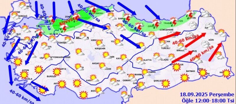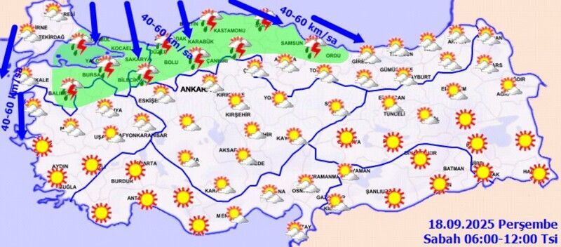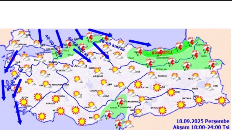 Bugün Marmara’nın doğusu, Doğu Akdeniz, İç Anadolu’nun güneydoğusu, Karadeniz, Doğu Anadolu’nun kuzeyi ile Adıyaman, Kilis ve Gaziantep çevrelerinde sağanak ve gök gürültülü sağanak yağış görülecek. Yağışların özellikle Doğu Karadeniz kıyıları, Hatay ve Osmaniye’de yerel olarak kuvvetli olması öngörülüyor. Vatandaşların sel, su baskını, ulaşımda aksama, yıldırım, kısa süreli fırtına ve ani rüzgarlara karşı dikkatli olması gerekiyor.