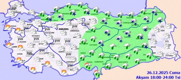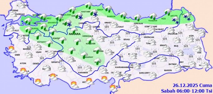 Meteoroloji Genel Müdürlüğü’nün 26 Aralık Cuma günü için yayımladığı son tahminlere göre, Türkiye genelinde hava koşulları sert şekilde değişiyor. Yağmur ve sağanak yağış birçok bölgede etkili olurken, akşam ve gece saatlerinden itibaren iç ve yüksek kesimlerde karla karışık yağmur ve kar yağışı bekleniyor. Özellikle Karadeniz ve İç Anadolu’da ulaşımı etkileyebilecek hava olaylarına karşı uyarılar yapıldı. Sıcaklıkların yurt genelinde 4 ila 10 derece arasında hissedilir şekilde düşmesi beklenirken, bazı bölgelerde kuvvetli yağış, sis, pus, buzlanma ve don riski öne çıkıyor. Zonguldak, Bartın ve Düzce için “yerel kuvvetli yağış” uyarısı yapılırken, denizlerde ise fırtına ve fırtınamsı rüzgâr bekleniyor.
