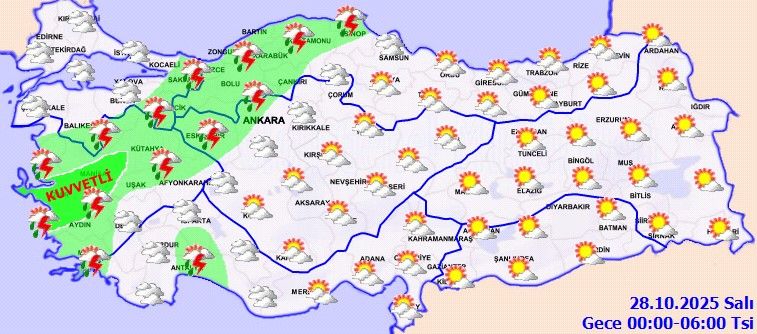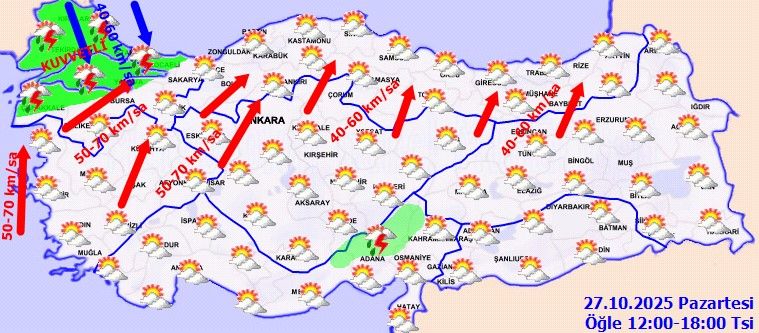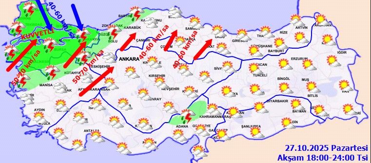 Bölge genelinde akşam ve gece sağanak ve gök gürültülü sağanak bekleniyor. Rüzgar iç kesimlerde fırtına (40-70 km/s) şeklinde esecek.