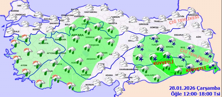 Genellikle yağmur ve sağanak şeklinde görülecek yağışlar, yurdun doğu kesimlerinde yerini karla karışık yağmur ve kara bırakacak. Vatandaşların sel, su baskını ve ulaşımda aksamalara karşı tedbirli olması büyük önem taşıyor.