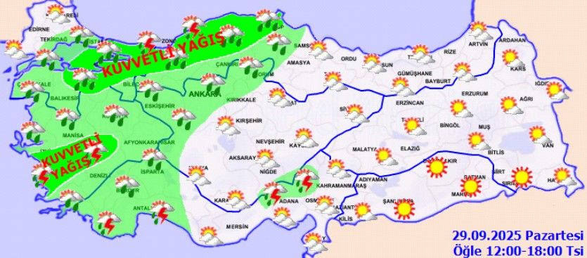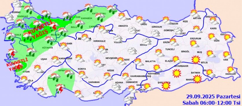 Marmara’nın doğusu, Batı ve Orta Karadeniz, İzmir’in güneyi, Aydın, Uşak, Afyonkarahisar, Kırıkkale ve Yozgat çevrelerinde kuvvetli yağış riski var. Vatandaşlar sel, su baskını, yıldırım, ani fırtına ve ulaşımda aksamalar gibi olumsuzluklara karşı dikkatli olmalı.