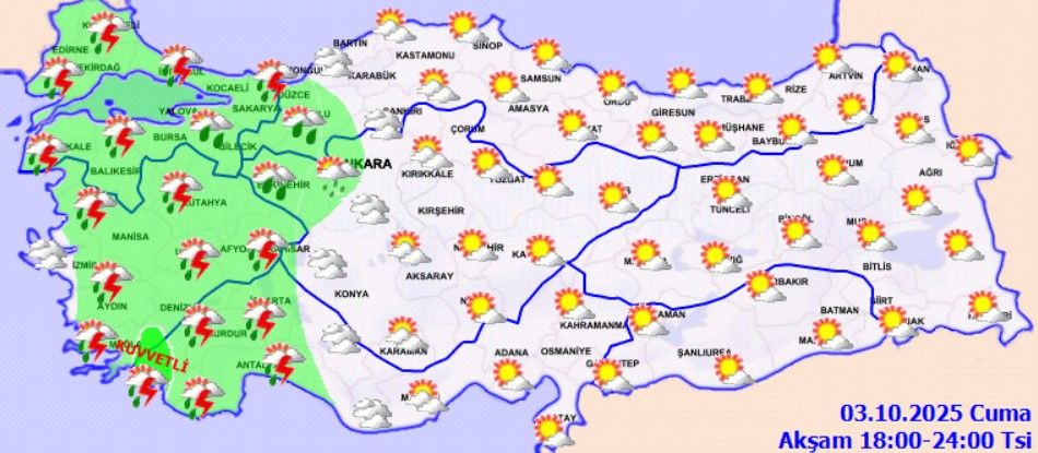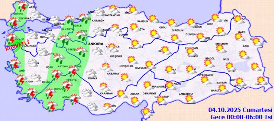 MGM’den yapılan uyarıya göre; Marmara’nın batısında (Edirne, Çanakkale, Balıkesir, Kırklareli ve Tekirdağ’ın batısı), Kıyı Ege’de (İzmir, Aydın, Muğla, Denizli’nin güney ve batısı) sağanak ve gök gürültülü sağanak yağışlar kuvvetli (21-60 kg/m²) olacak. Muğla’nın Marmaris, Ula, Köyceğiz, Dalaman, Ortaca ve Fethiye ilçelerinde yağışların çok kuvvetli ve yer yer şiddetli (51-100 kg/m²) olacağı tahmin ediliyor.