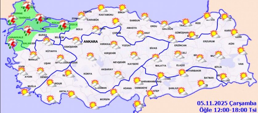 Meteoroloji Genel Müdürlüğü tarafından yapılan son değerlendirmelere göre, 11 Kasım Salı günü Türkiye genelinde hava parçalı ve yer yer çok bulutlu olacak. Marmara, Ege, Doğu Akdeniz, Antalya, Eskişehir, Kayseri, Sivas, Niğde, Zonguldak, Bartın, Bolu, Düzce, Gaziantep ve Kilis çevrelerinde sağanak ve gök gürültülü sağanak yağışlar bekleniyor.