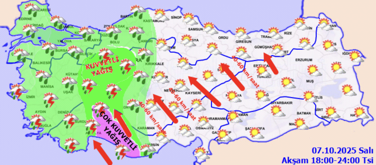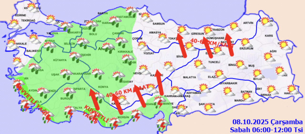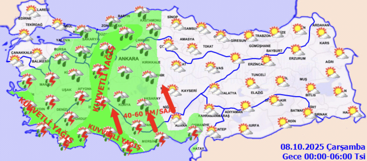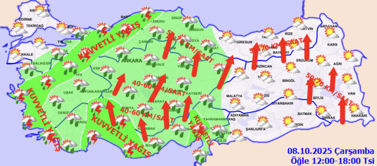 Meteoroloji Genel Müdürlüğü (MGM), 8 Ekim Çarşamba günü için Türkiye’nin kuzey, iç ve batı kesimleri başta olmak üzere çok sayıda şehirde kuvvetli sağanak ve fırtına uyarısı yaptı. Sıcaklıkların yağış alan bölgelerde 4-6 derece birden düşeceği, rüzgarın ise özellikle Akdeniz’in iç kesimleri ve İç Anadolu’da saatte 70 km’ye kadar ulaşabileceği açıklandı.