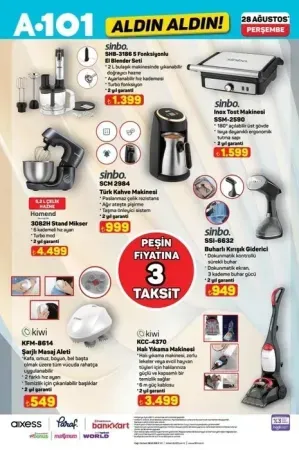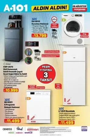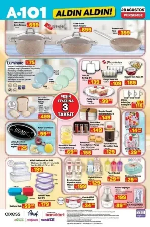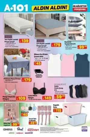 A101 aktüel 28 Ağustos 2025 kataloğu yayımlandı. Yeni haftanın indirimleriyle raflarda birbirinden avantajlı ürünler yerini alıyor. Lastikli çarşaf, masa örtüsü, takı organizeri, çalışma masası ve koltuğu, kurutma makinesi, bulaşık makinesi, su sebili gibi ürünlerde büyük fırsatlar dikkat çekiyor. Ayrıca blender seti, tost makinesi, halı yıkama makinesi, buharlı kırışık giderici, tencere ve saklama kapları da kampanyada öne çıkıyor. İşte 28 Ağustos Perşembe gününden itibaren A101 aktüel raflarda yerini alacak ürünler ve fiyat listesi…
