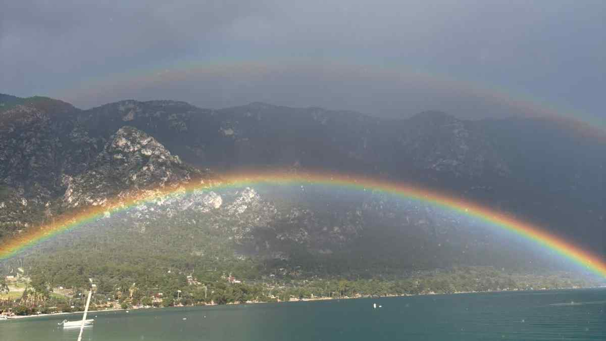 Yağmur bulutlarının dağılmasıyla birlikte gökyüzünde önce ana gökkuşağı belirdi, ardından daha silik ikinci bir yay da onun üzerinde oluştu. Deniz ve dağ siluetiyle bütünleşen çifte gökkuşağı, kısa süreliğine göründü ancak ortaya çıkan görüntü kartpostalları aratmadı. Bölgeye gelen tatilciler ve yerel halk bu anları cep telefonlarıyla kaydetti.