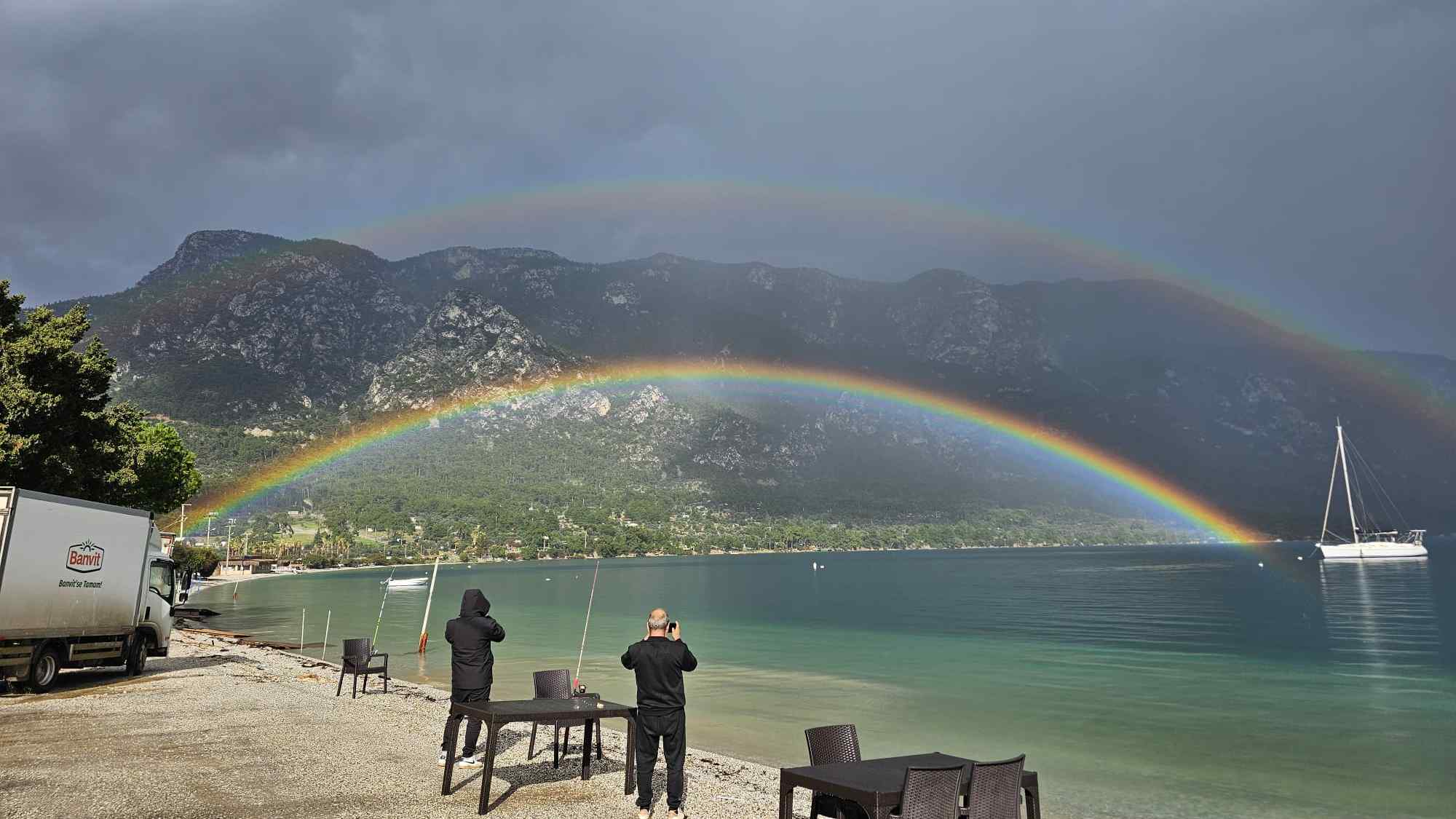 Muğla’nın Menteşe ilçesinde sağanak yağış sonrası ortaya çıkan manzara, görenleri hayretler içinde bıraktı. "Cennet Koyu" olarak bilinen dünyaca ünlü Akbük, bu kez gökyüzünde beliren aynı anda iki gökkuşağıyla renklerine renk kattı. Nadir görülen bu doğa olayı, bölgedeki vatandaşlara adeta görsel bir ziyafet sundu.
