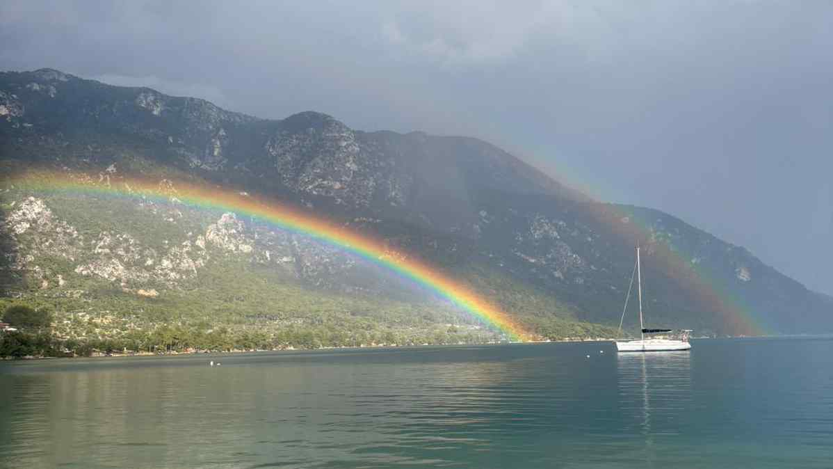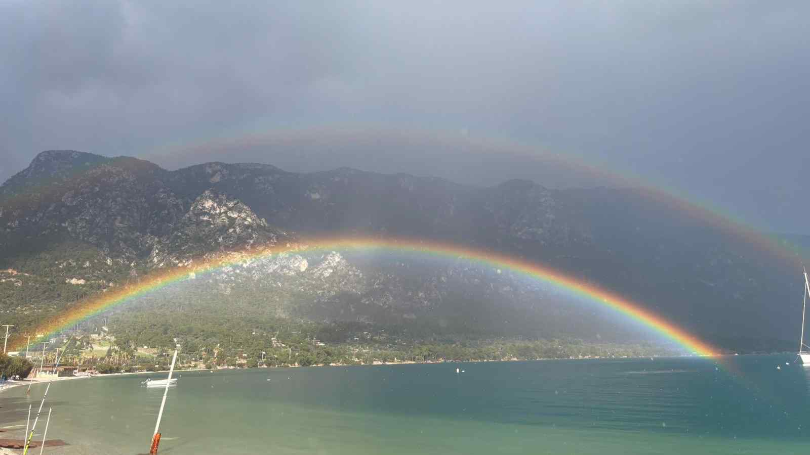 Muğla’nın Menteşe ilçesine bağlı Akbük koyu, sağanak yağışın ardından bu kez tek değil, iki gökkuşağıyla gökyüzünü renklendirdi. pic.twitter.com/kRotTMxGuU