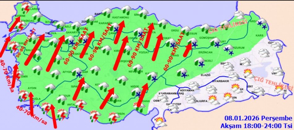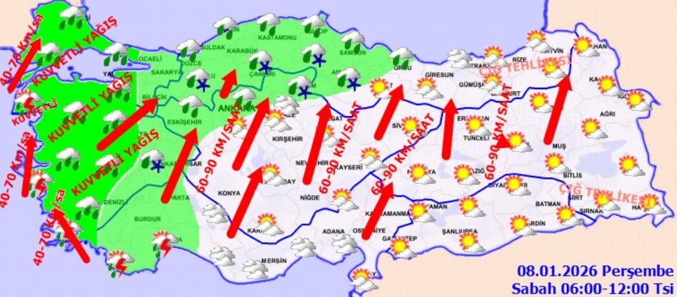 Türkiye, 8 Aralık Perşembe gününe hareketli bir gökyüzüyle uyanıyor. Meteoroloji’den gelen son verilere göre; Marmara’dan Doğu Anadolu’ya kadar neredeyse tüm iller yağışlı sistemin etkisi altında. Ancak asıl tehlike sadece yağmur değil; şiddetli fırtına ve çığ riski de kapıda!