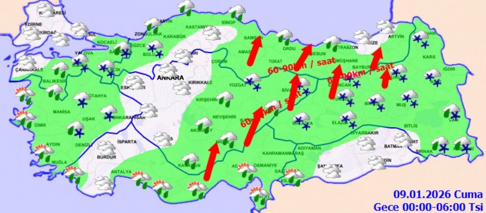 Çok bulutlu, sabah saatlerinden itibaren aralıklı yağmurlu, yüksekleri karla karışık yağmur ve kar yağışlı