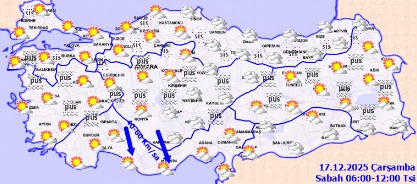 Meteoroloji Genel Müdürlüğü’nün 17 Aralık Çarşamba gününe ilişkin son hava tahminlerine göre, Türkiye genelinde yağış beklenmiyor. Ülkenin kuzey, iç ve doğu kesimlerinde parçalı, yer yer çok bulutlu hava etkili olurken; diğer bölgelerde az bulutlu ve açık bir gökyüzü öngörülüyor. Sabah ve gece saatlerinde özellikle iç ve doğu kesimlerde hafif buzlanma ve don olaylarıyla birlikte pus ve yer yer sis oluşabileceği bildirildi.Hava sıcaklıklarının, yurdun kuzey kesimleri ile kıyı bölgelerde mevsim normallerinin üzerinde seyretmesi bekleniyor. Diğer bölgelerde ise sıcaklıkların mevsim normalleri civarında olacağı tahmin ediliyor. Rüzgarın genel olarak kuzey yönlerden hafif, zaman zaman orta kuvvette eseceği tahmin edilirken; Akdeniz’in iç kesimlerinde kuzey ve kuzeydoğudan yer yer kuvvetli (40–60 km/saat) rüzgar bekleniyor.