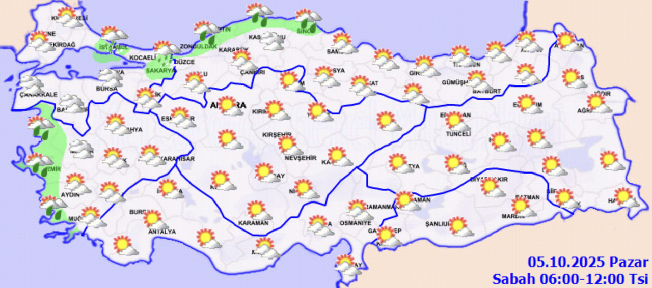 Hava Durumu: Parçalı ve çok bulutlu, sağanak ve gök gürültülü sağanak yağışlı. Rüzgar: Batı Karadeniz'de doğu ve kuzeydoğudan 4 ila 6 yer yer 7, öğle saatlerinden sonra batısı yer yer 8; Doğu Karadeniz'de doğu ve güneydoğudan 3 ila 5, yer yer 6 kuvvetinde. Dalga: 1,5 ila 2,5 m, batısı yer yer 3,5 m. Görüş: İyi, yağış anında orta.