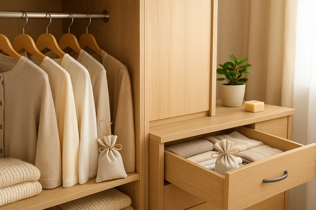 Dolap ve çekmecelerdeki nem kokusundan kurtulmak için lavanta keseleri, defne yaprakları, sabun parçaları veya karanfil dolu küçük bez torbalar kullanabilirsiniz. Bu yöntem hem kıyafetlerinize hoş bir koku verir hem de böceklenmeyi engeller.