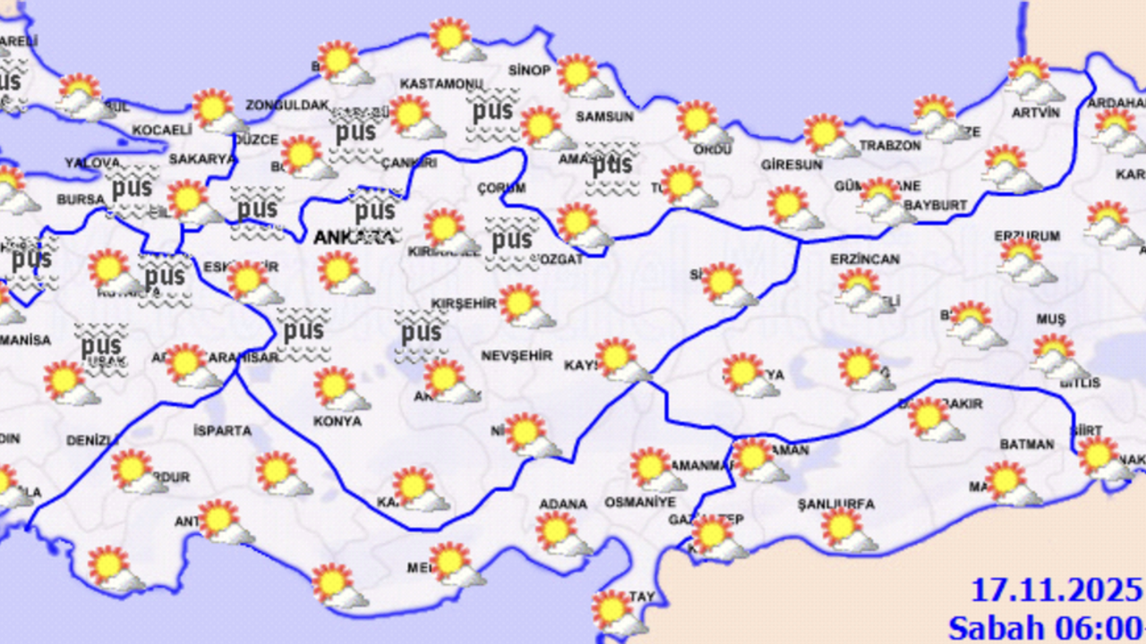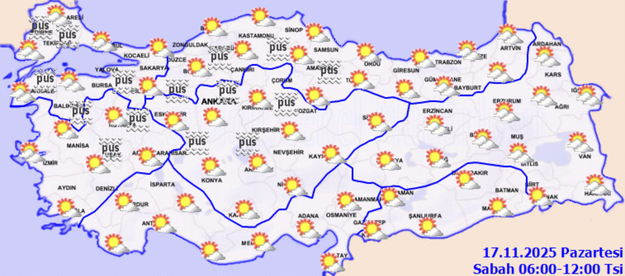 Gece ve sabah saatlerinde Akdeniz’in iç kesimleri, İç Anadolu’nun güney ve doğusu, Doğu Anadolu, Güneydoğu Anadolu’nun kuzeyi ile Orta ve Doğu Karadeniz’in iç bölgelerinde yoğun sis ve pus bekleniyor. Görüş mesafesinde düşüşler yaşanabileceği için sürücülerin tedbirli olması isteniyor.