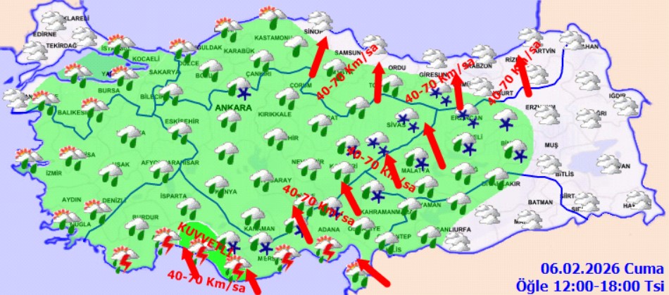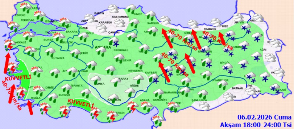 Çok bulutlu, öğle saatlerinden sonra yağmurlu, yüksekleri karla karışık yağmur ve kar yağışlı