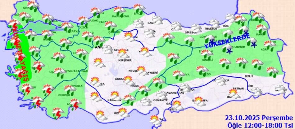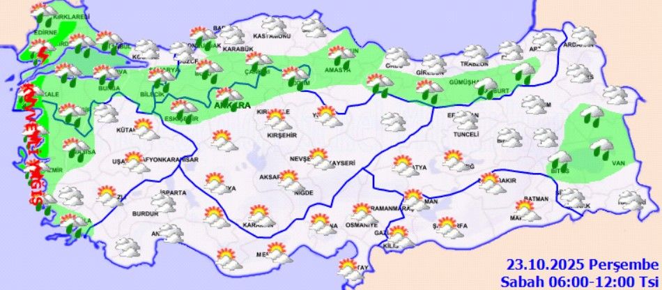Genel olarak parçalı ve çok bulutlu, bölge genelinde aralıklı sağanak yağışlı.