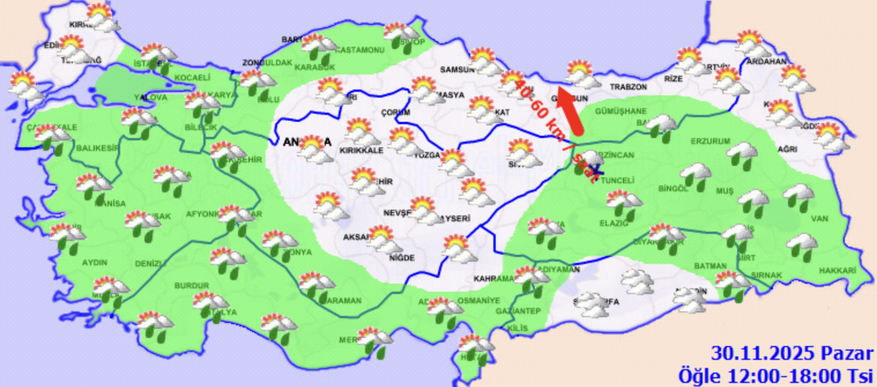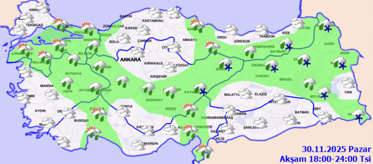 Meteoroloji Genel Müdürlüğü tarafından yapılan tahminlere göre, 30 Kasım Pazar günü ülke genelinde hava parçalı ve çok bulutlu olacak. Marmara'nın güneyi ve doğusu, Ege, Akdeniz, İç Anadolu, Batı Karadeniz, Orta ve Doğu Karadeniz’in iç kesimleri, Doğu Anadolu (Van hariç), Güneydoğu Anadolu (Mardin hariç) ile Samsun çevrelerinde yağış bekleniyor. Yağışların büyük bölümü sağanak ve gök gürültülü sağanak şeklinde olurken; İç Anadolu’nun doğusu, Doğu Anadolu’nun kuzey ve doğusu ile Doğu Karadeniz’in yükseklerinde karla karışık yağmur ve yer yer kar yağışı öngörülüyor. Mersin, Adana ve Hatay’ın kıyı kesimlerinde yağışların yerel olarak kuvvetli olması bekleniyor.
