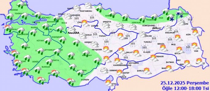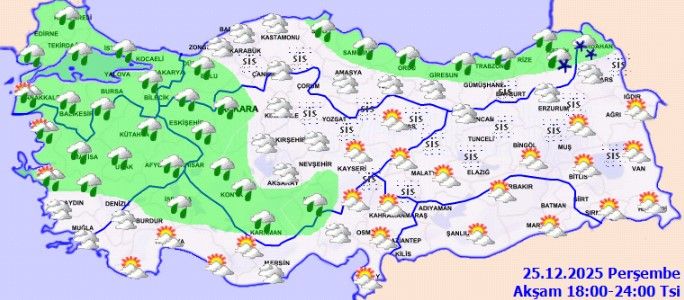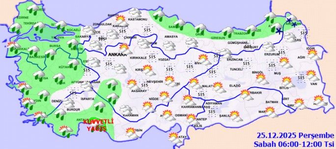 Meteoroloji Genel Müdürlüğü’nün tahminlerine göre; ülkemiz genelinin parçalı ve yer yer çok bulutlu geçmesi bekleniyor. Marmara, Ege, Batı Akdeniz, İç Anadolu’nun güney ve batısı, Orta ve Doğu Karadeniz kıyıları, Zonguldak, Düzce, Bolu ve Sinop çevreleri ile Kastamonu’nun kıyı kesimleri ve Mersin’in batı kesimleri yağmur ve sağanak yağışlı olacak. Artvin ve Ardahan çevrelerinde karla karışık yağmur ve kar bekleniyor. Antalya’nın doğusunda yağışların yerel olarak kuvvetli olması öngörülüyor. Kuzey, iç ve doğu kesimlerde yer yer sis ve pus bekleniyor.